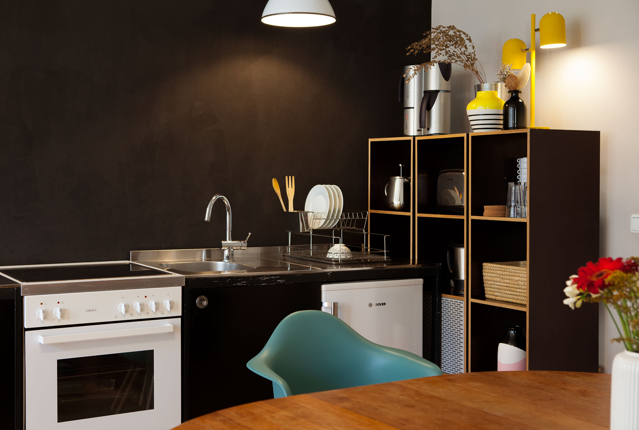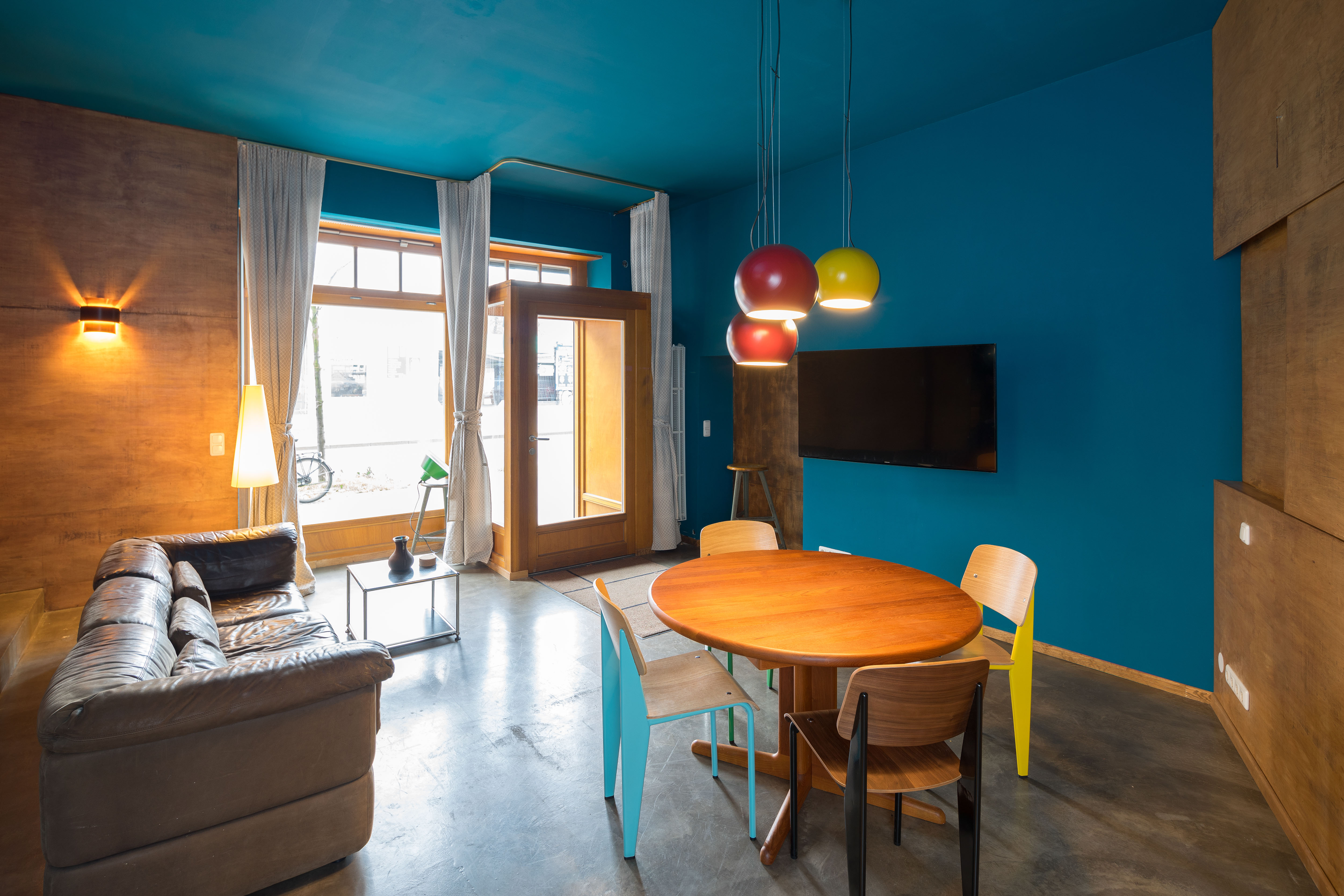 Street level studio apartment. Multi-purpose space focusing on a unique overnight experience. Large sliding doors and curtains aid in blocking off the street noise and at the same time create a cosy and warm environment.