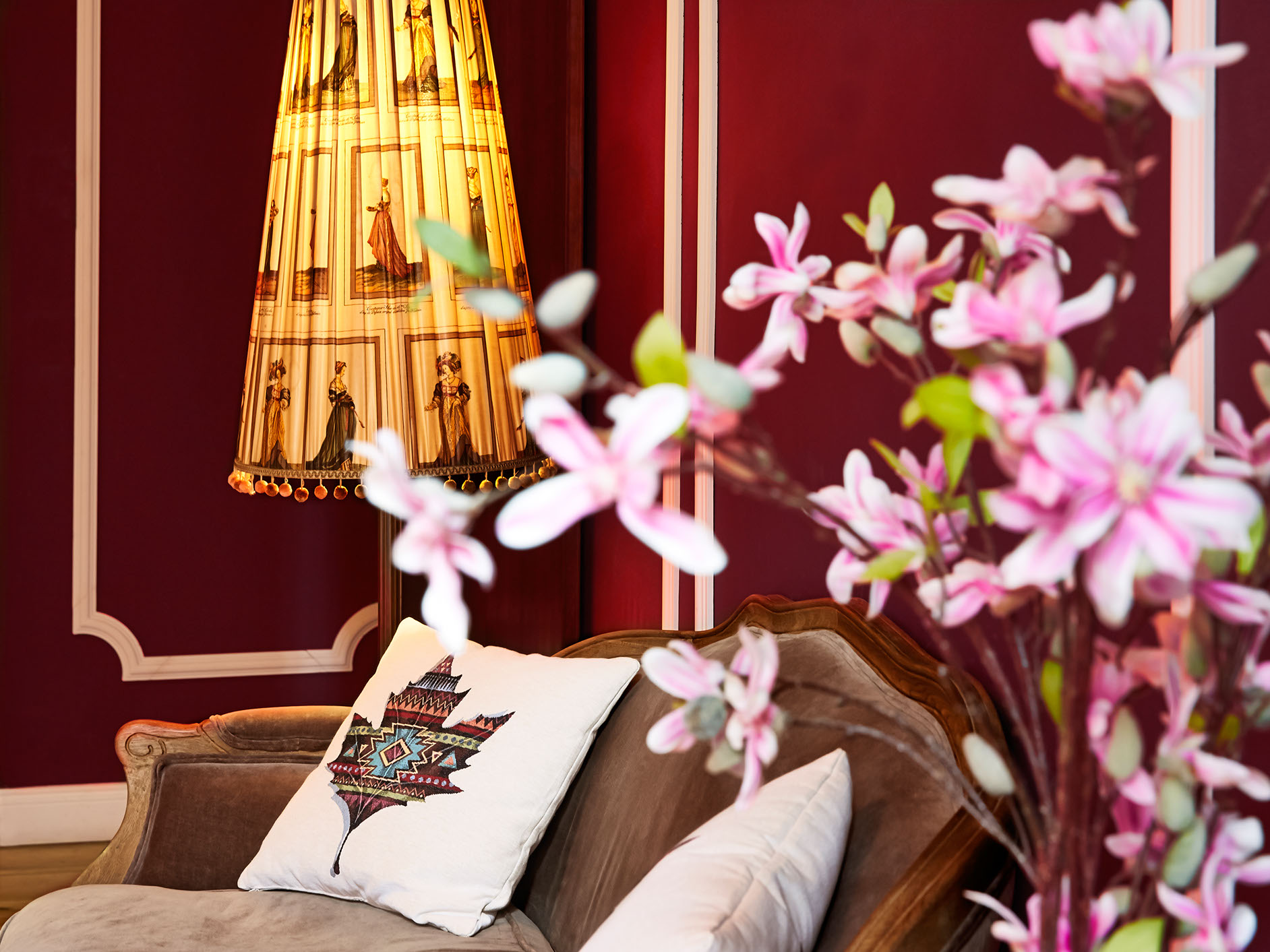 The focus of this room is a very impressive four poster bed which frames the cloudy wall textures with its massive wooden beams. It's a bed, day bed, sofa and lounge chair all in one.