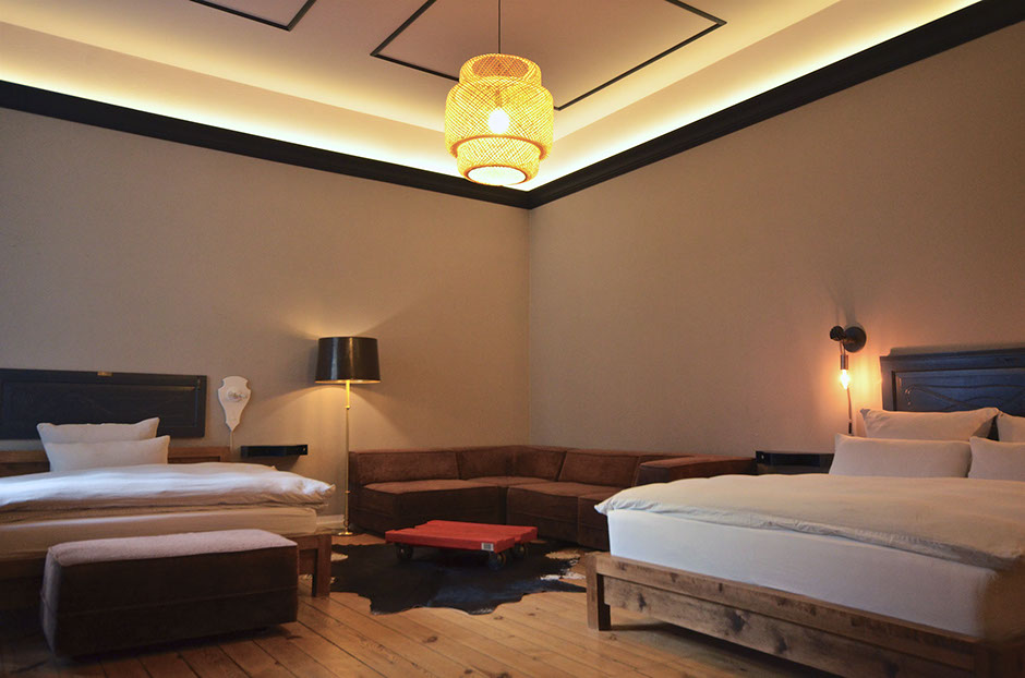 One small room with a double sized bed (140cm x 200cm), one larger room with two 160cm x 200cm beds and one lounge with sofa. Located on the first floor of a restored building with super high ceilings and large windows. The smaller room consists of a vintage wall rack and a niche is wallpapered with book pages of a famous German mountain climbers tales and adventures.