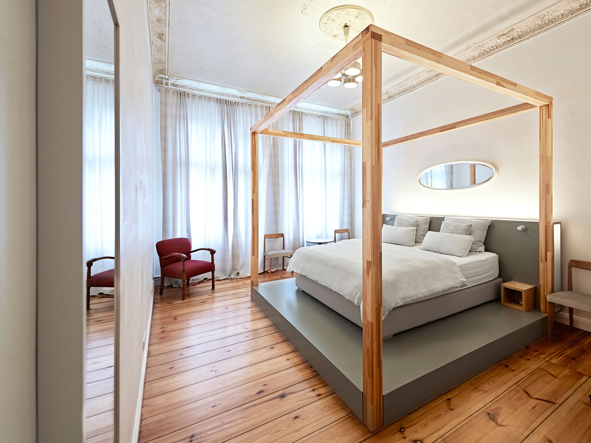 The focus of this room is a very impressive four poster bed which frames the cloudy wall textures with its massive wooden beams. It's a bed, day bed, sofa and lounge chair all in one.