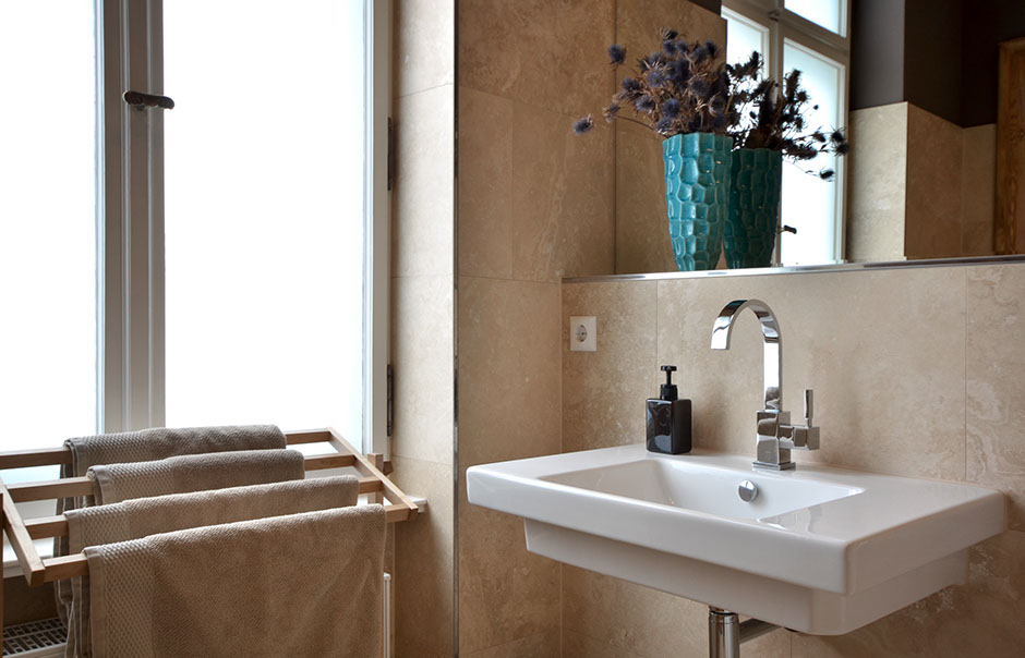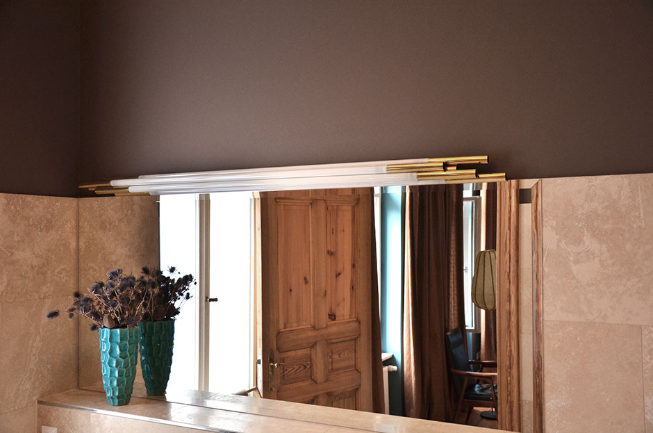 Geometric bronze coloured curtains add the perfect level of warmth back into the space. Lighting illuminates the ceiling revealing the details of the newly restored stucco in the room and bathroom.